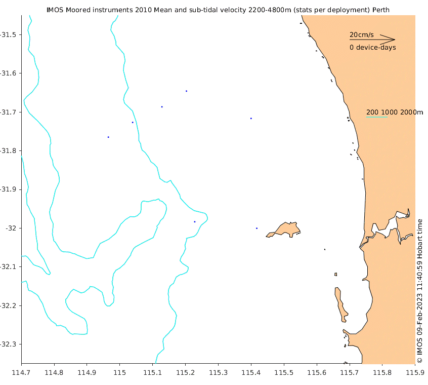 These maps show some basic analyses of the velocity data: mean and sub-tidal variance for several layers and time-windows, and tidal harmonics for the depth-average velocity using the whole record. Click through to see more detailed plots of the selected dataset or to download those data from the AODN thredds server.