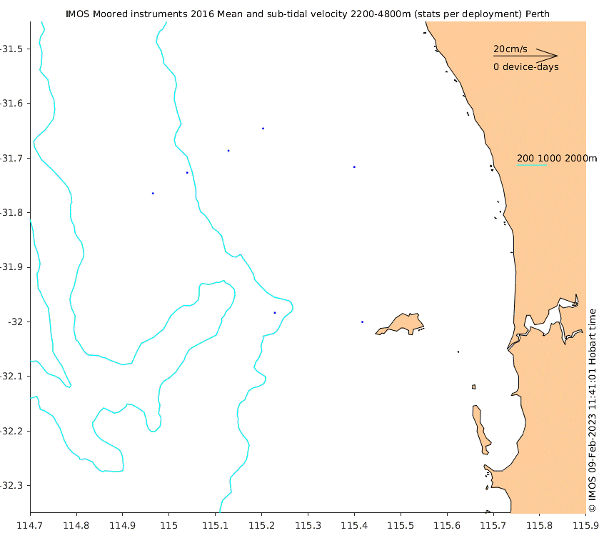 These maps show some basic analyses of the velocity data: mean and sub-tidal variance for several layers and time-windows, and tidal harmonics for the depth-average velocity using the whole record. Click through to see more detailed plots of the selected dataset or to download those data from the AODN thredds server.