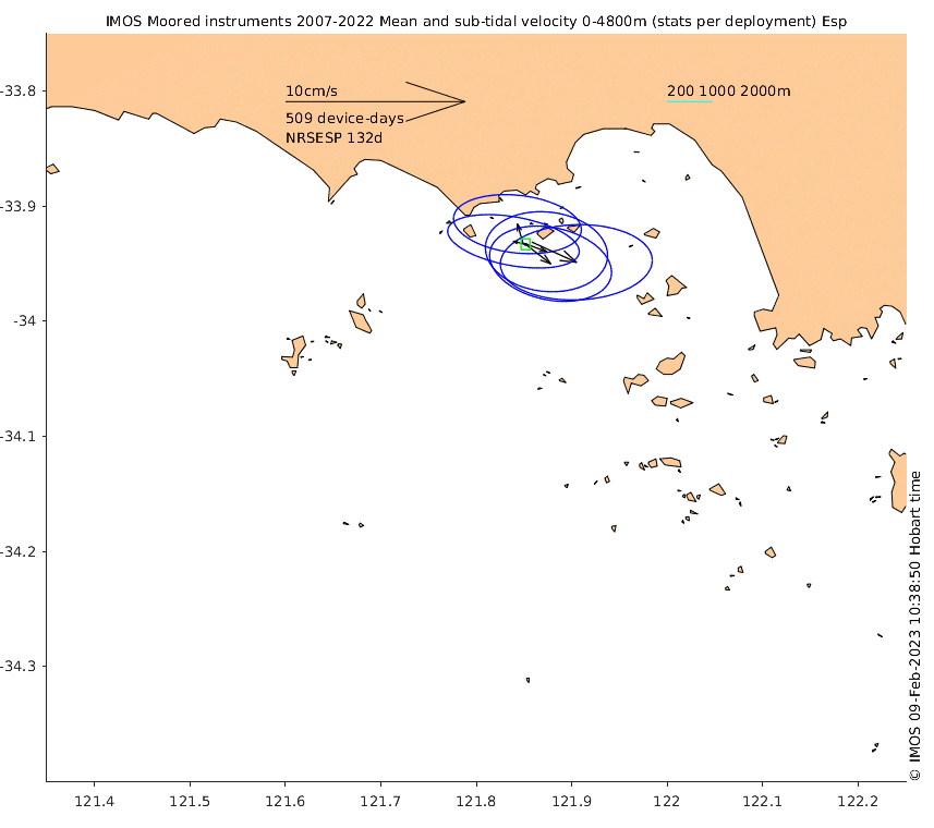 These maps show some basic analyses of the velocity data: mean and sub-tidal variance for several layers and time-windows, and tidal harmonics for the depth-average velocity using the whole record. Click through to see more detailed plots of the selected dataset or to download those data from the AODN thredds server.