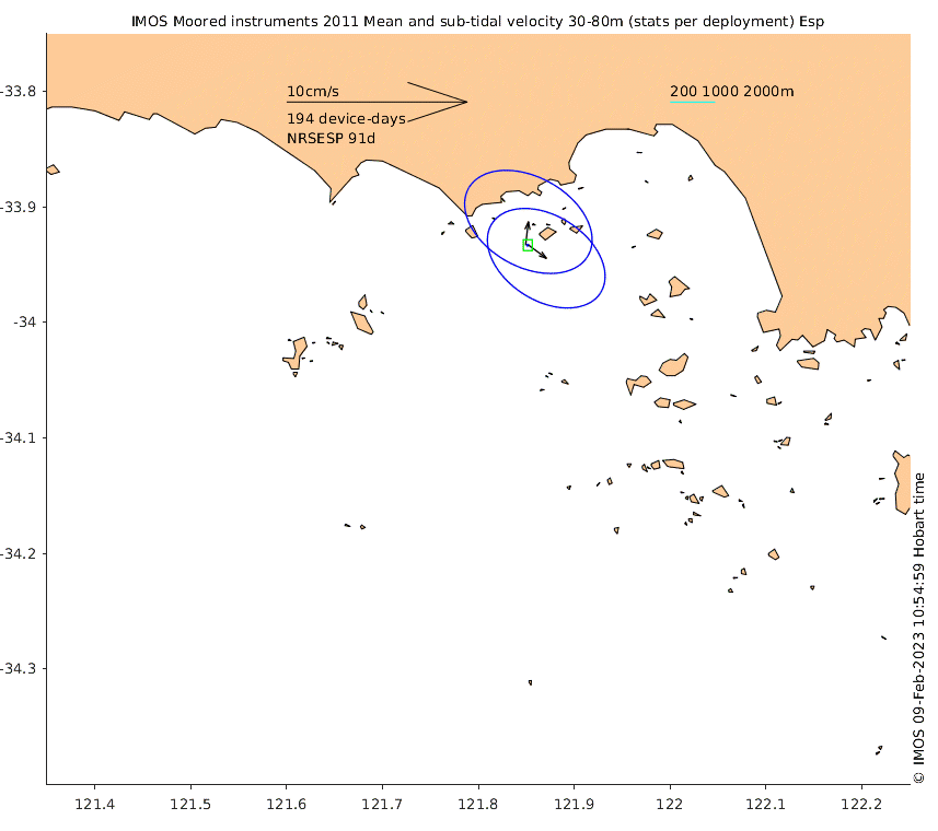 These maps show some basic analyses of the velocity data: mean and sub-tidal variance for several layers and time-windows, and tidal harmonics for the depth-average velocity using the whole record. Click through to see more detailed plots of the selected dataset or to download those data from the AODN thredds server.