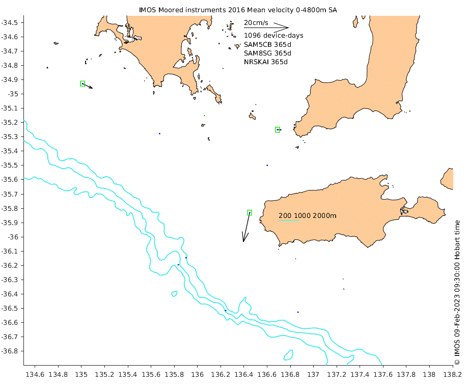 These maps show some basic analyses of the velocity data: mean and sub-tidal variance for several layers and time-windows, and tidal harmonics for the depth-average velocity using the whole record. Click through to see more detailed plots of the selected dataset or to download those data from the AODN thredds server.