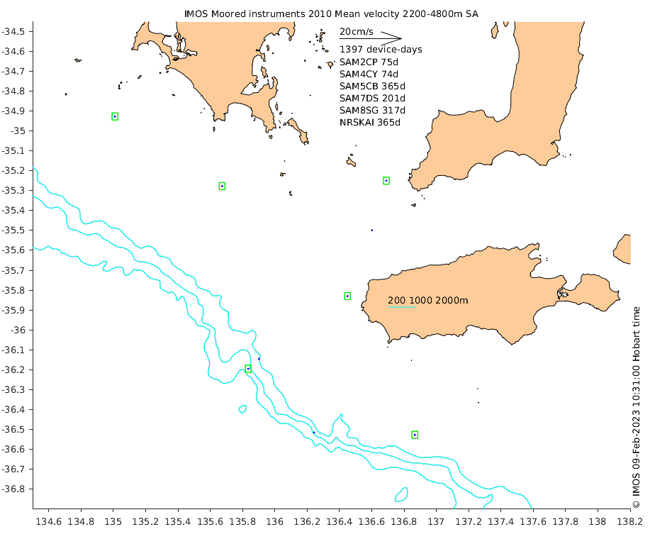 These maps show some basic analyses of the velocity data: mean and sub-tidal variance for several layers and time-windows, and tidal harmonics for the depth-average velocity using the whole record. Click through to see more detailed plots of the selected dataset or to download those data from the AODN thredds server.
