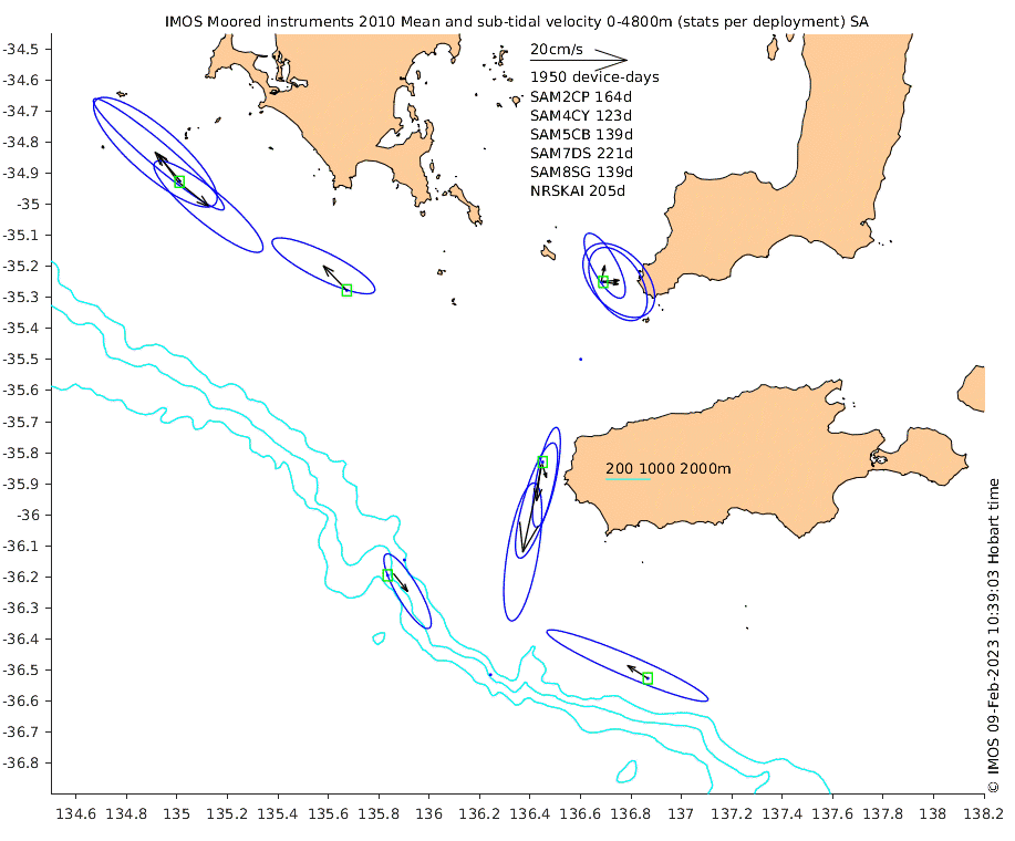 These maps show some basic analyses of the velocity data: mean and sub-tidal variance for several layers and time-windows, and tidal harmonics for the depth-average velocity using the whole record. Click through to see more detailed plots of the selected dataset or to download those data from the AODN thredds server.
