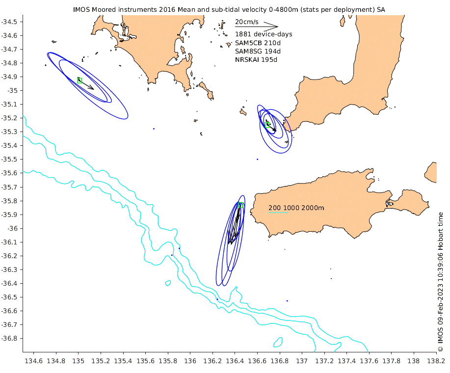 These maps show some basic analyses of the velocity data: mean and sub-tidal variance for several layers and time-windows, and tidal harmonics for the depth-average velocity using the whole record. Click through to see more detailed plots of the selected dataset or to download those data from the AODN thredds server.
