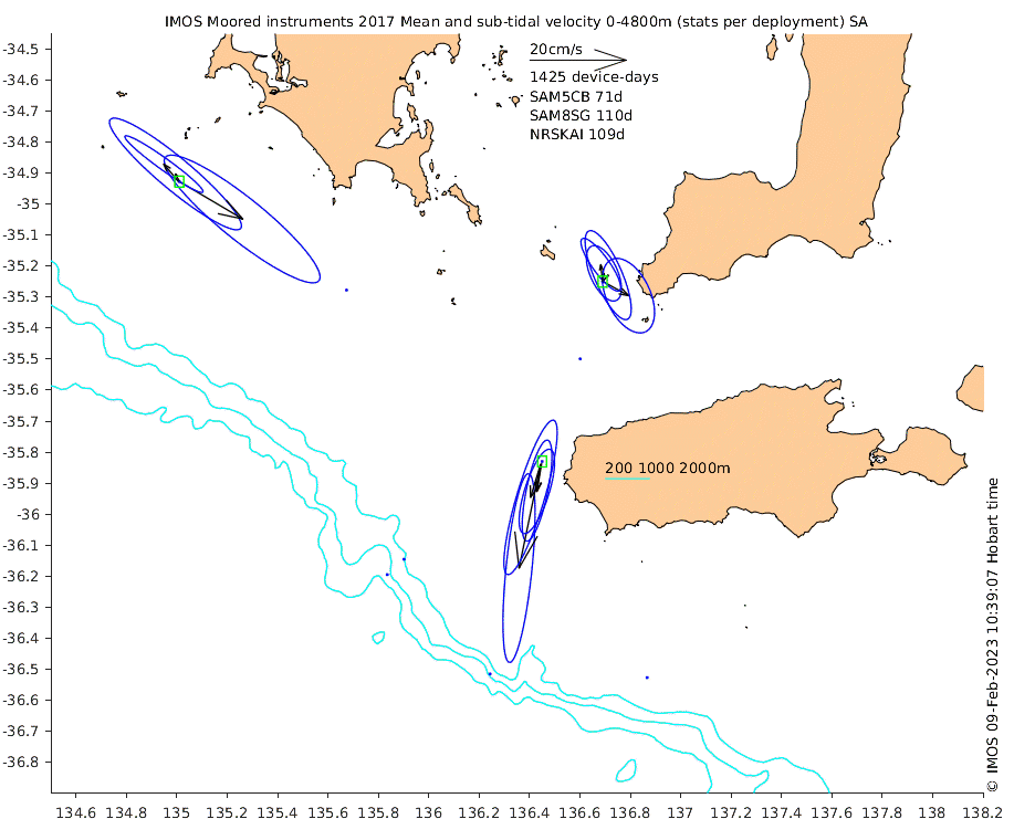 These maps show some basic analyses of the velocity data: mean and sub-tidal variance for several layers and time-windows, and tidal harmonics for the depth-average velocity using the whole record. Click through to see more detailed plots of the selected dataset or to download those data from the AODN thredds server.