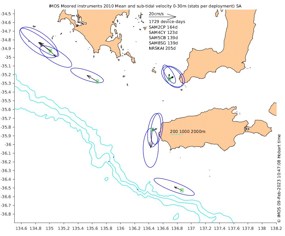 These maps show some basic analyses of the velocity data: mean and sub-tidal variance for several layers and time-windows, and tidal harmonics for the depth-average velocity using the whole record. Click through to see more detailed plots of the selected dataset or to download those data from the AODN thredds server.