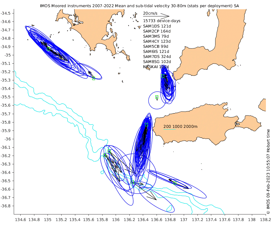 These maps show some basic analyses of the velocity data: mean and sub-tidal variance for several layers and time-windows, and tidal harmonics for the depth-average velocity using the whole record. Click through to see more detailed plots of the selected dataset or to download those data from the AODN thredds server.