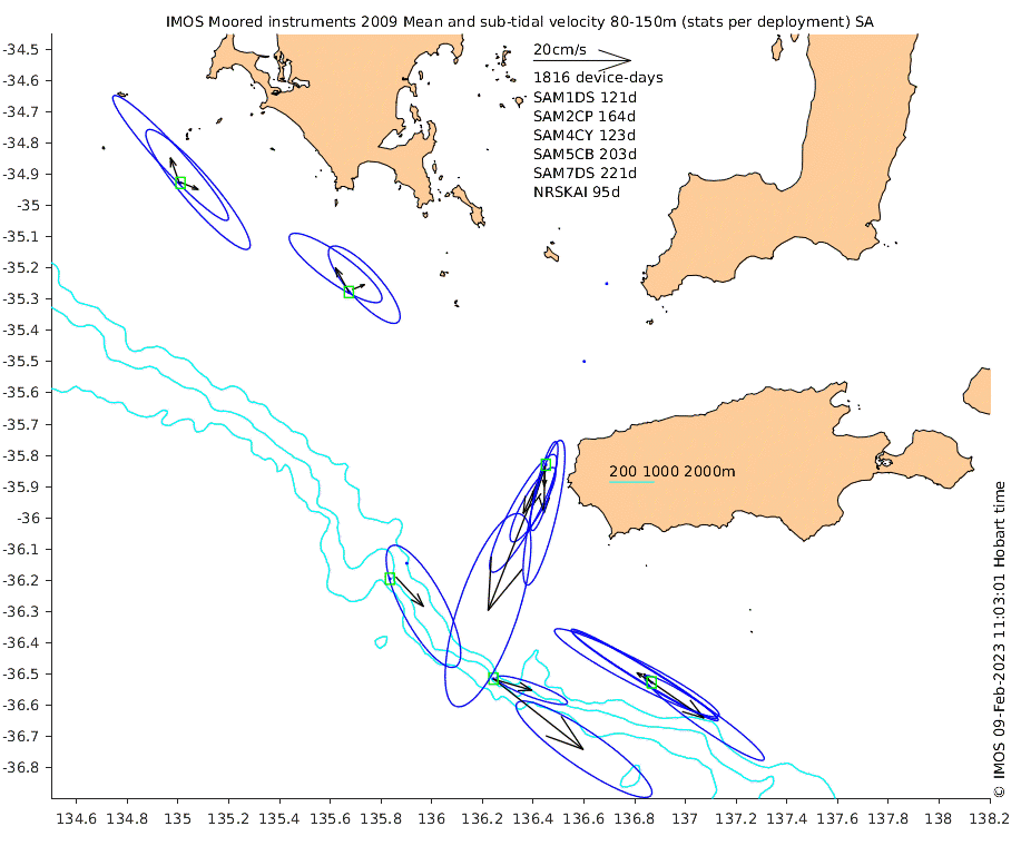 These maps show some basic analyses of the velocity data: mean and sub-tidal variance for several layers and time-windows, and tidal harmonics for the depth-average velocity using the whole record. Click through to see more detailed plots of the selected dataset or to download those data from the AODN thredds server.