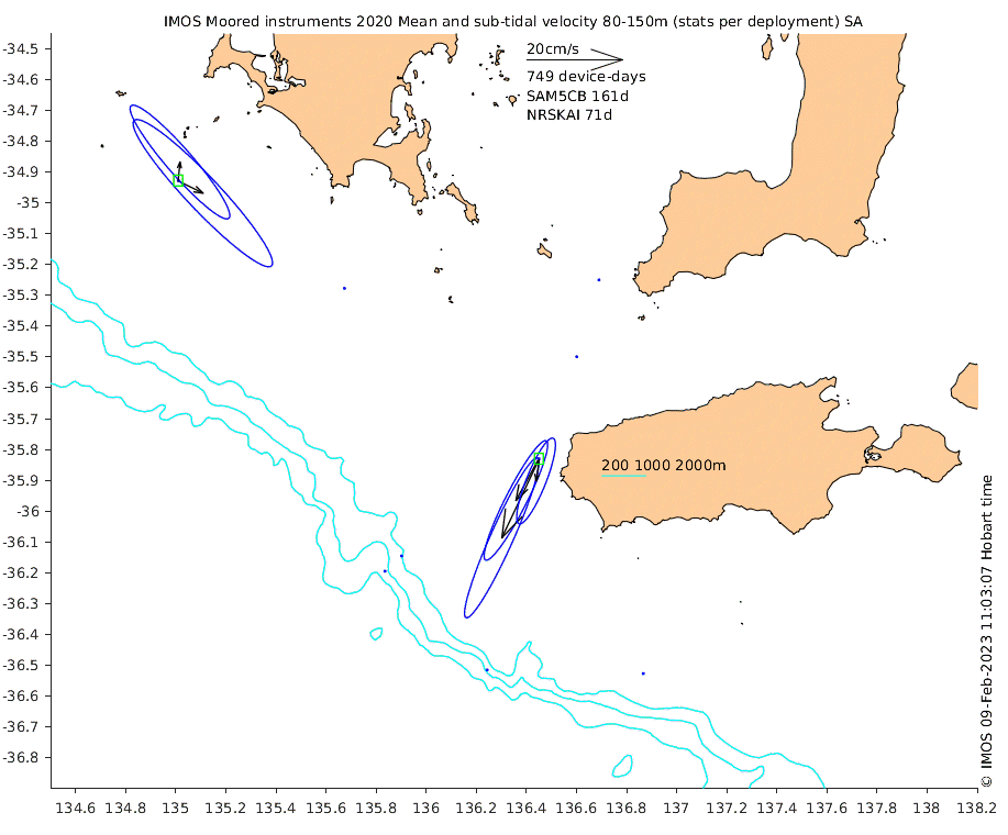 These maps show some basic analyses of the velocity data: mean and sub-tidal variance for several layers and time-windows, and tidal harmonics for the depth-average velocity using the whole record. Click through to see more detailed plots of the selected dataset or to download those data from the AODN thredds server.
