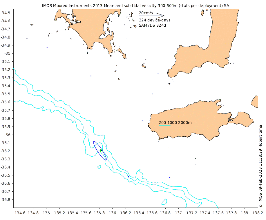 These maps show some basic analyses of the velocity data: mean and sub-tidal variance for several layers and time-windows, and tidal harmonics for the depth-average velocity using the whole record. Click through to see more detailed plots of the selected dataset or to download those data from the AODN thredds server.