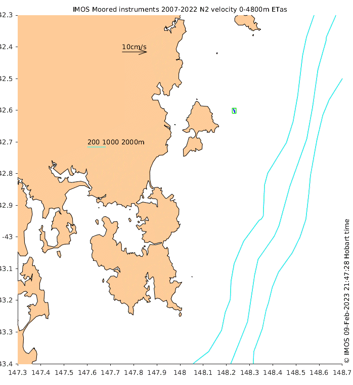 These maps show some basic analyses of the velocity data: mean and sub-tidal variance for several layers and time-windows, and tidal harmonics for the depth-average velocity using the whole record. Click through to see more detailed plots of the selected dataset or to download those data from the AODN thredds server.