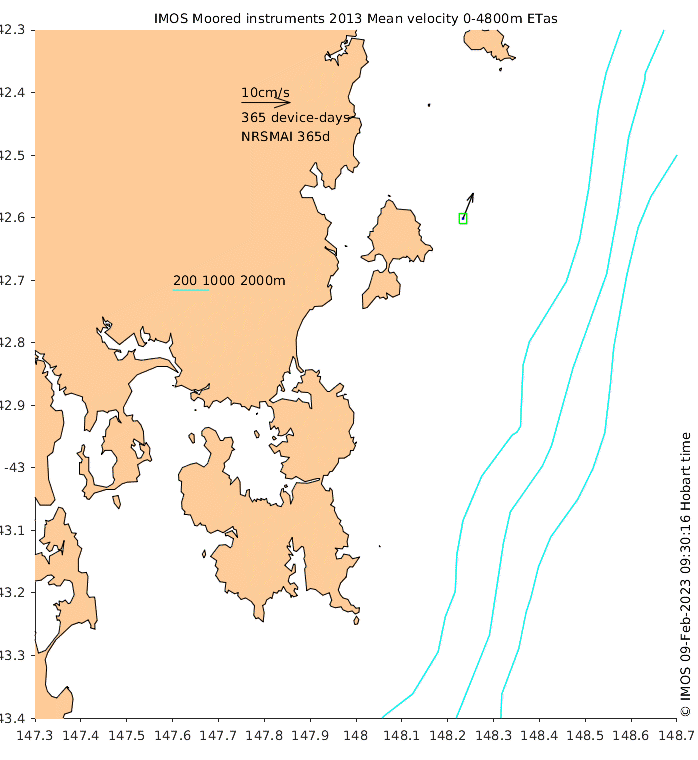 These maps show some basic analyses of the velocity data: mean and sub-tidal variance for several layers and time-windows, and tidal harmonics for the depth-average velocity using the whole record. Click through to see more detailed plots of the selected dataset or to download those data from the AODN thredds server.