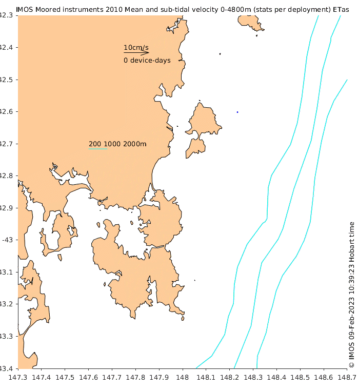 These maps show some basic analyses of the velocity data: mean and sub-tidal variance for several layers and time-windows, and tidal harmonics for the depth-average velocity using the whole record. Click through to see more detailed plots of the selected dataset or to download those data from the AODN thredds server.