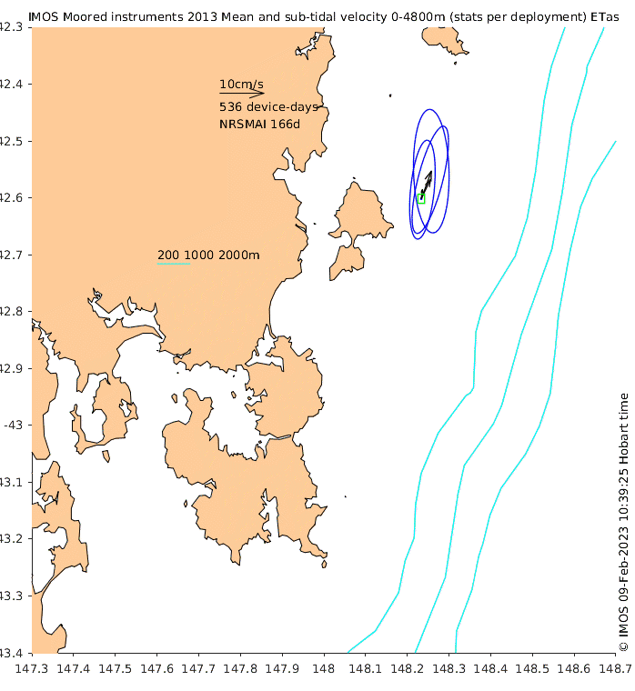 These maps show some basic analyses of the velocity data: mean and sub-tidal variance for several layers and time-windows, and tidal harmonics for the depth-average velocity using the whole record. Click through to see more detailed plots of the selected dataset or to download those data from the AODN thredds server.