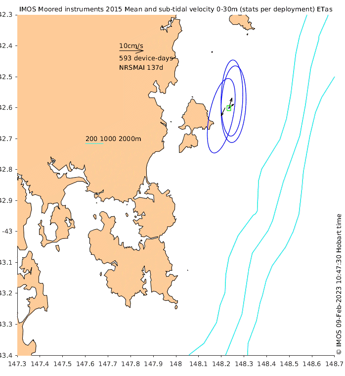 These maps show some basic analyses of the velocity data: mean and sub-tidal variance for several layers and time-windows, and tidal harmonics for the depth-average velocity using the whole record. Click through to see more detailed plots of the selected dataset or to download those data from the AODN thredds server.