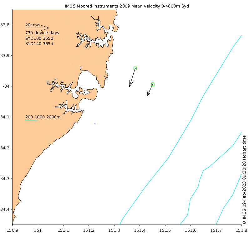 These maps show some basic analyses of the velocity data: mean and sub-tidal variance for several layers and time-windows, and tidal harmonics for the depth-average velocity using the whole record. Click through to see more detailed plots of the selected dataset or to download those data from the AODN thredds server.