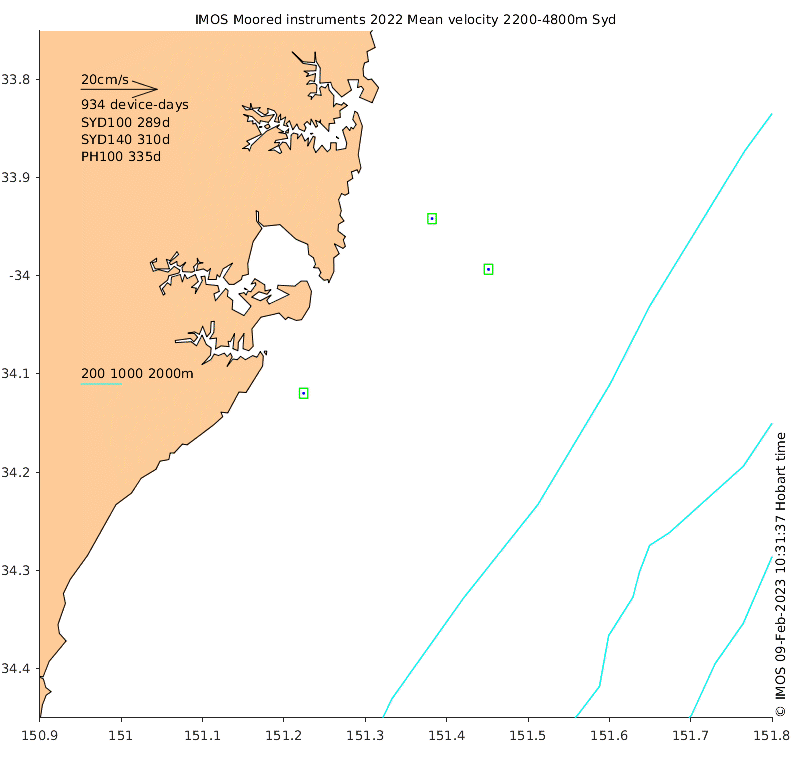 These maps show some basic analyses of the velocity data: mean and sub-tidal variance for several layers and time-windows, and tidal harmonics for the depth-average velocity using the whole record. Click through to see more detailed plots of the selected dataset or to download those data from the AODN thredds server.