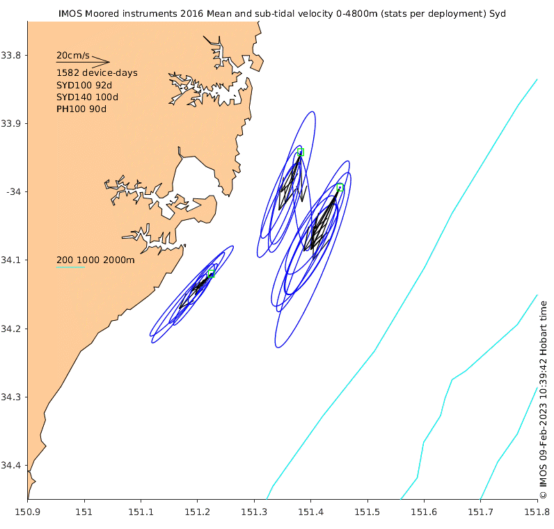These maps show some basic analyses of the velocity data: mean and sub-tidal variance for several layers and time-windows, and tidal harmonics for the depth-average velocity using the whole record. Click through to see more detailed plots of the selected dataset or to download those data from the AODN thredds server.
