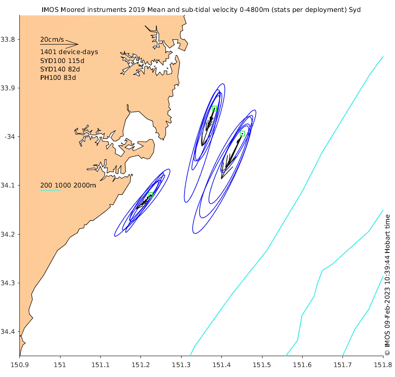 These maps show some basic analyses of the velocity data: mean and sub-tidal variance for several layers and time-windows, and tidal harmonics for the depth-average velocity using the whole record. Click through to see more detailed plots of the selected dataset or to download those data from the AODN thredds server.