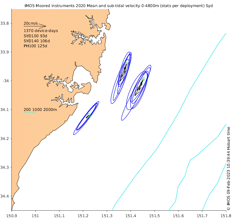 These maps show some basic analyses of the velocity data: mean and sub-tidal variance for several layers and time-windows, and tidal harmonics for the depth-average velocity using the whole record. Click through to see more detailed plots of the selected dataset or to download those data from the AODN thredds server.