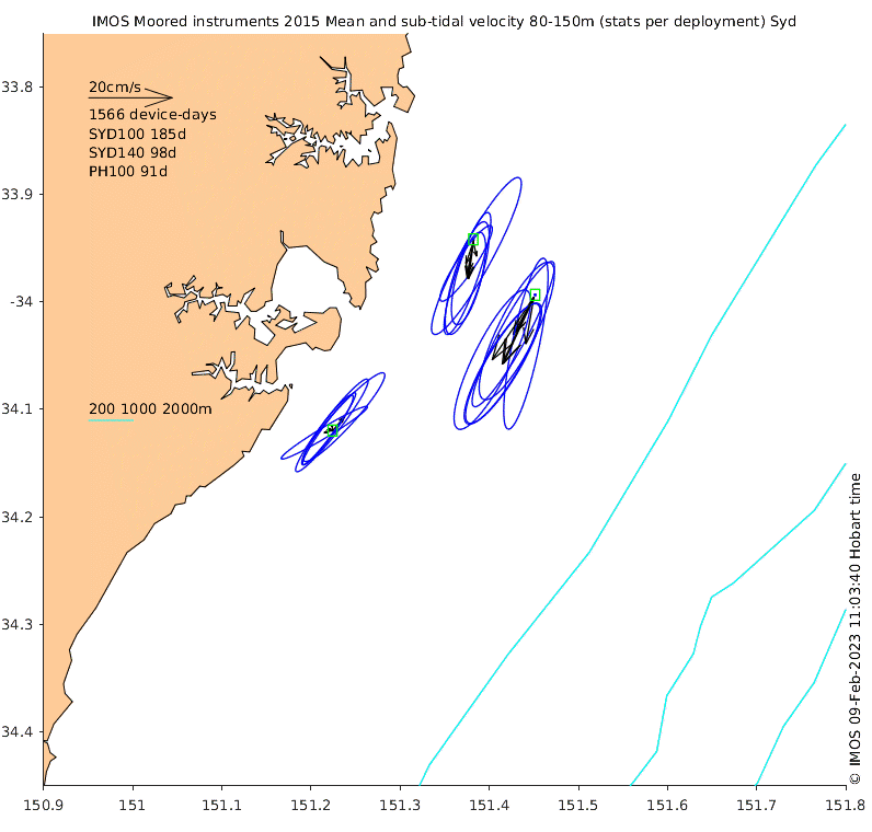 These maps show some basic analyses of the velocity data: mean and sub-tidal variance for several layers and time-windows, and tidal harmonics for the depth-average velocity using the whole record. Click through to see more detailed plots of the selected dataset or to download those data from the AODN thredds server.