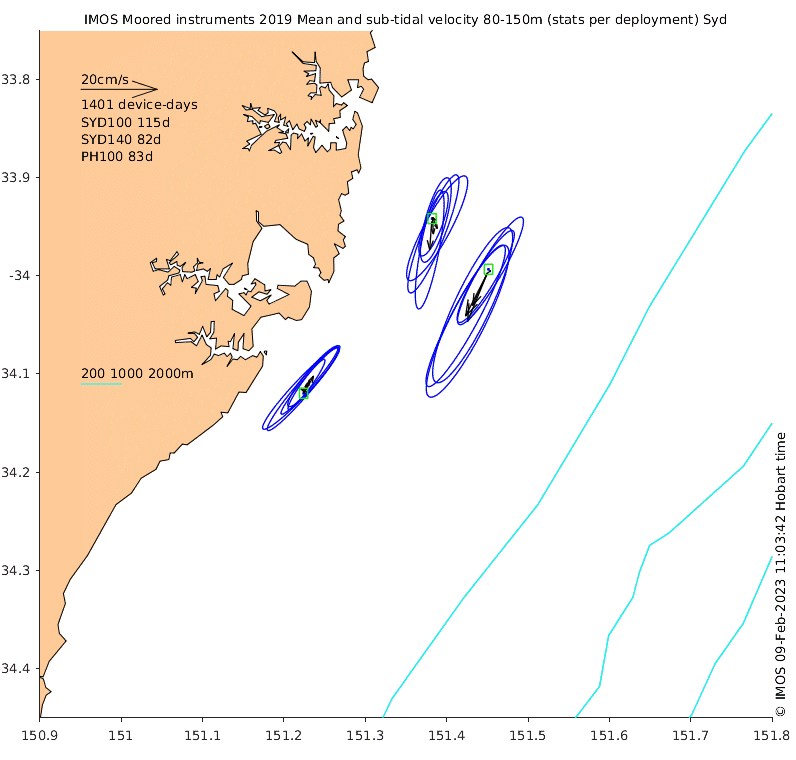 These maps show some basic analyses of the velocity data: mean and sub-tidal variance for several layers and time-windows, and tidal harmonics for the depth-average velocity using the whole record. Click through to see more detailed plots of the selected dataset or to download those data from the AODN thredds server.