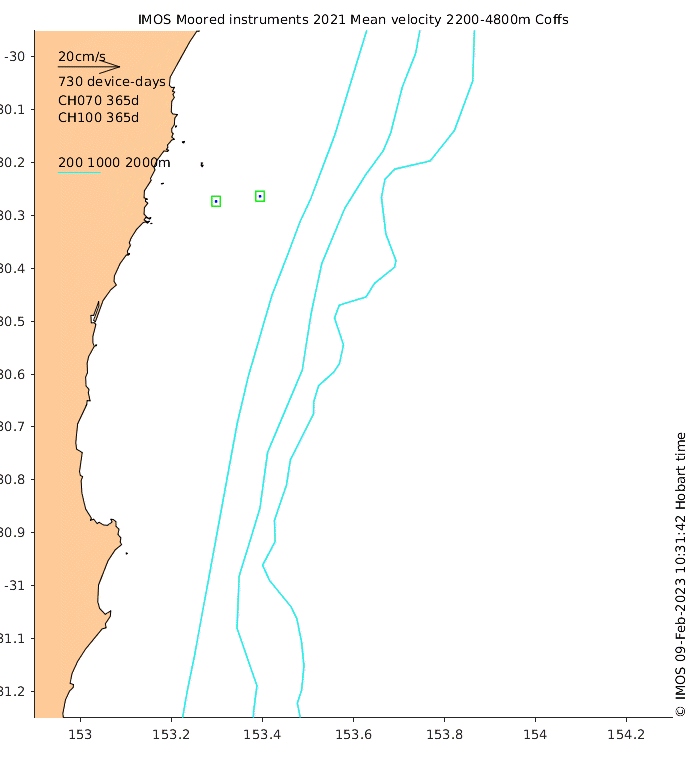 These maps show some basic analyses of the velocity data: mean and sub-tidal variance for several layers and time-windows, and tidal harmonics for the depth-average velocity using the whole record. Click through to see more detailed plots of the selected dataset or to download those data from the AODN thredds server.