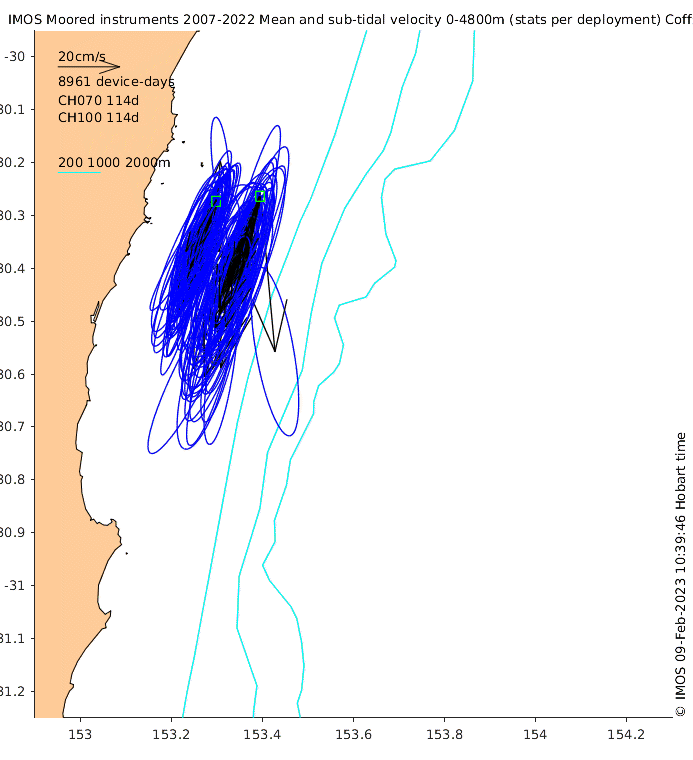These maps show some basic analyses of the velocity data: mean and sub-tidal variance for several layers and time-windows, and tidal harmonics for the depth-average velocity using the whole record. Click through to see more detailed plots of the selected dataset or to download those data from the AODN thredds server.