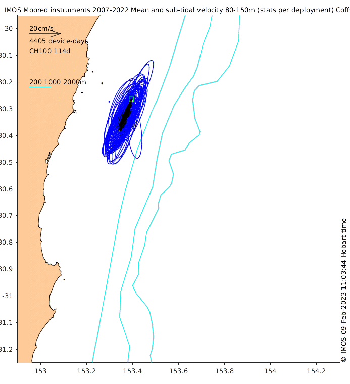 These maps show some basic analyses of the velocity data: mean and sub-tidal variance for several layers and time-windows, and tidal harmonics for the depth-average velocity using the whole record. Click through to see more detailed plots of the selected dataset or to download those data from the AODN thredds server.
