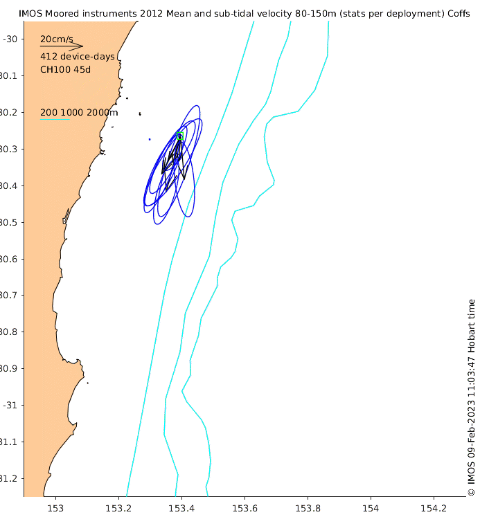 These maps show some basic analyses of the velocity data: mean and sub-tidal variance for several layers and time-windows, and tidal harmonics for the depth-average velocity using the whole record. Click through to see more detailed plots of the selected dataset or to download those data from the AODN thredds server.