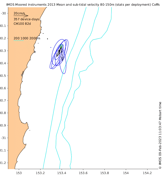 These maps show some basic analyses of the velocity data: mean and sub-tidal variance for several layers and time-windows, and tidal harmonics for the depth-average velocity using the whole record. Click through to see more detailed plots of the selected dataset or to download those data from the AODN thredds server.
