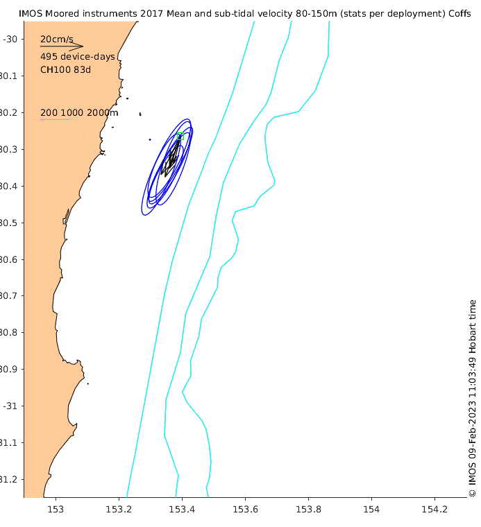 These maps show some basic analyses of the velocity data: mean and sub-tidal variance for several layers and time-windows, and tidal harmonics for the depth-average velocity using the whole record. Click through to see more detailed plots of the selected dataset or to download those data from the AODN thredds server.