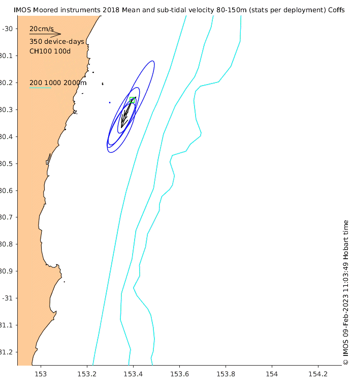 These maps show some basic analyses of the velocity data: mean and sub-tidal variance for several layers and time-windows, and tidal harmonics for the depth-average velocity using the whole record. Click through to see more detailed plots of the selected dataset or to download those data from the AODN thredds server.