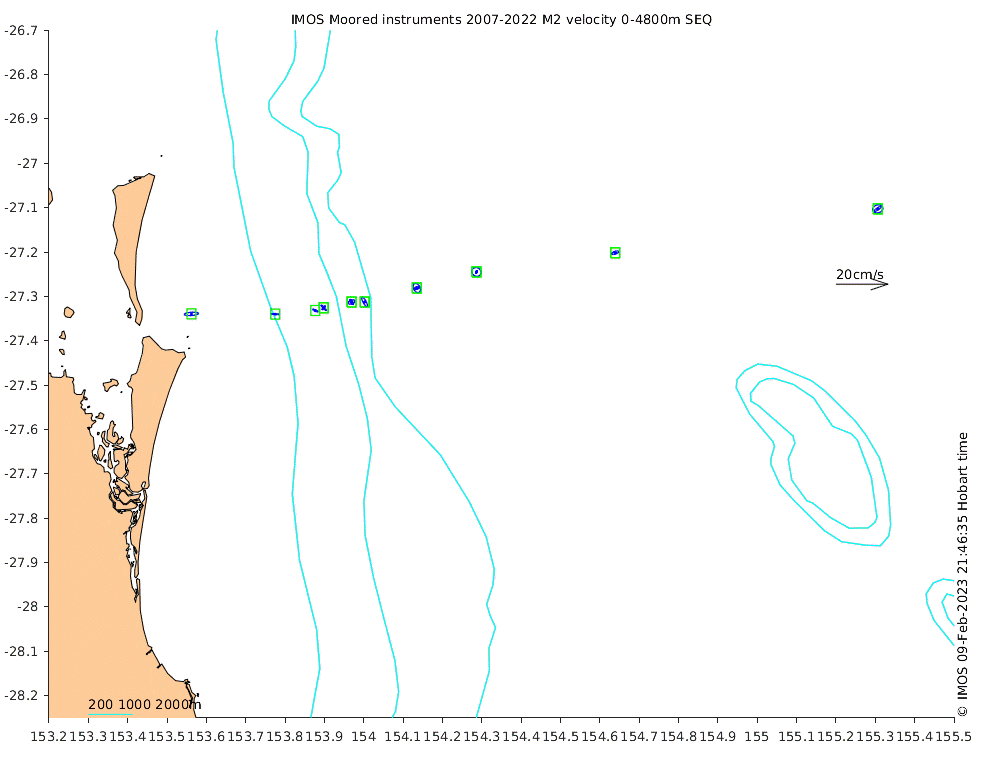 These maps show some basic analyses of the velocity data: mean and sub-tidal variance for several layers and time-windows, and tidal harmonics for the depth-average velocity using the whole record. Click through to see more detailed plots of the selected dataset or to download those data from the AODN thredds server.
