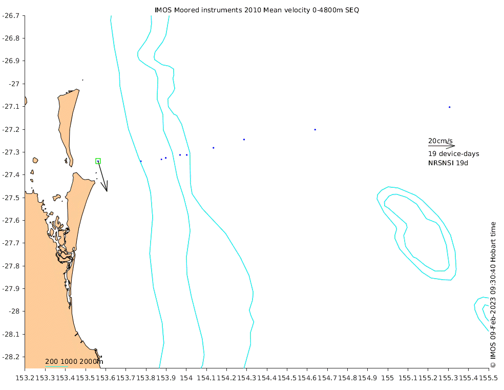 These maps show some basic analyses of the velocity data: mean and sub-tidal variance for several layers and time-windows, and tidal harmonics for the depth-average velocity using the whole record. Click through to see more detailed plots of the selected dataset or to download those data from the AODN thredds server.
