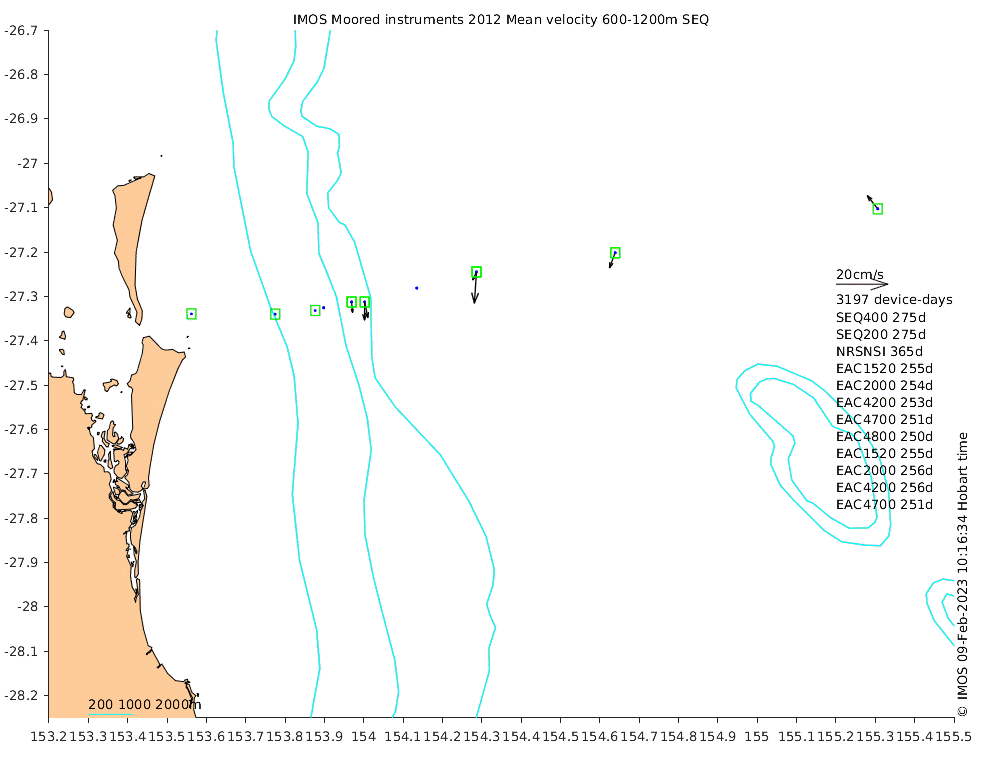 These maps show some basic analyses of the velocity data: mean and sub-tidal variance for several layers and time-windows, and tidal harmonics for the depth-average velocity using the whole record. Click through to see more detailed plots of the selected dataset or to download those data from the AODN thredds server.
