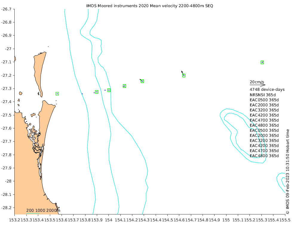 These maps show some basic analyses of the velocity data: mean and sub-tidal variance for several layers and time-windows, and tidal harmonics for the depth-average velocity using the whole record. Click through to see more detailed plots of the selected dataset or to download those data from the AODN thredds server.