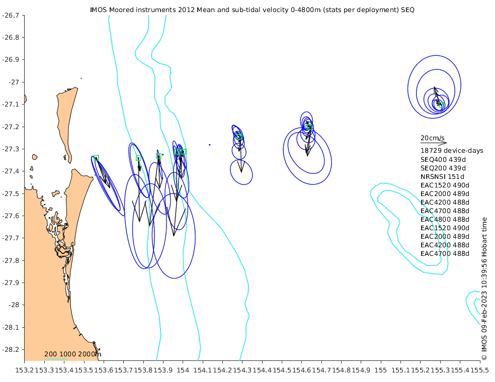 These maps show some basic analyses of the velocity data: mean and sub-tidal variance for several layers and time-windows, and tidal harmonics for the depth-average velocity using the whole record. Click through to see more detailed plots of the selected dataset or to download those data from the AODN thredds server.