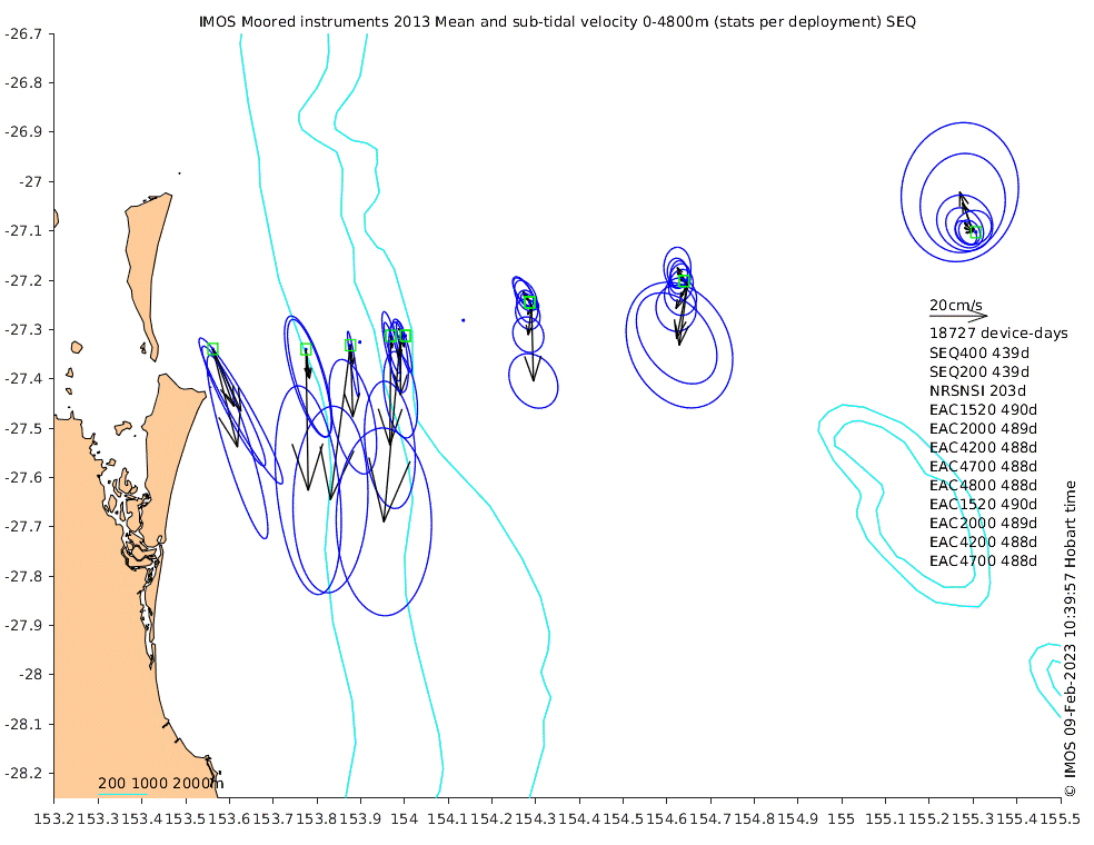 These maps show some basic analyses of the velocity data: mean and sub-tidal variance for several layers and time-windows, and tidal harmonics for the depth-average velocity using the whole record. Click through to see more detailed plots of the selected dataset or to download those data from the AODN thredds server.