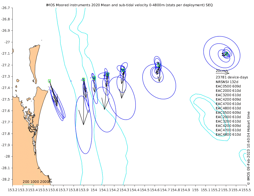 These maps show some basic analyses of the velocity data: mean and sub-tidal variance for several layers and time-windows, and tidal harmonics for the depth-average velocity using the whole record. Click through to see more detailed plots of the selected dataset or to download those data from the AODN thredds server.