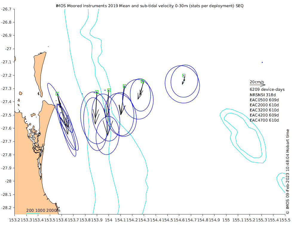 These maps show some basic analyses of the velocity data: mean and sub-tidal variance for several layers and time-windows, and tidal harmonics for the depth-average velocity using the whole record. Click through to see more detailed plots of the selected dataset or to download those data from the AODN thredds server.