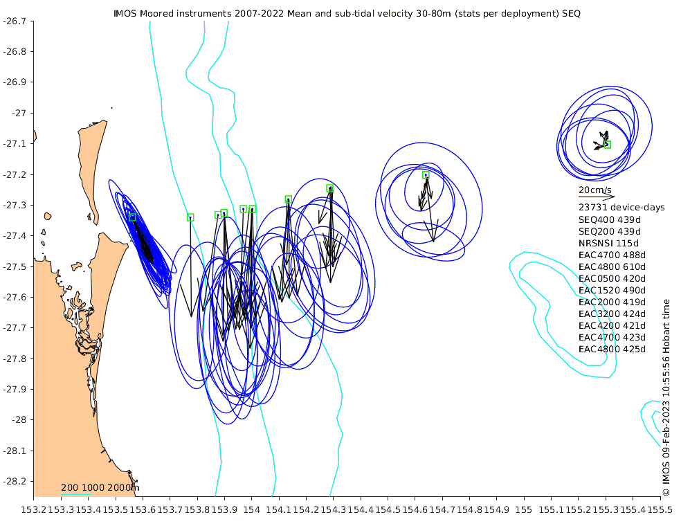 These maps show some basic analyses of the velocity data: mean and sub-tidal variance for several layers and time-windows, and tidal harmonics for the depth-average velocity using the whole record. Click through to see more detailed plots of the selected dataset or to download those data from the AODN thredds server.