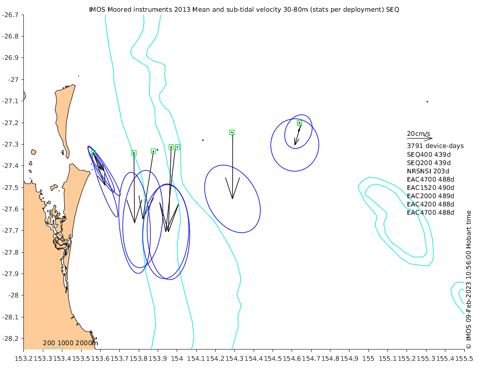 These maps show some basic analyses of the velocity data: mean and sub-tidal variance for several layers and time-windows, and tidal harmonics for the depth-average velocity using the whole record. Click through to see more detailed plots of the selected dataset or to download those data from the AODN thredds server.
