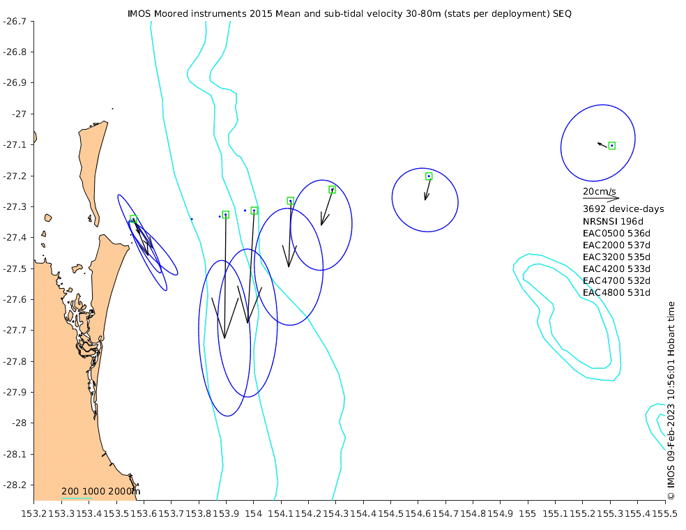 These maps show some basic analyses of the velocity data: mean and sub-tidal variance for several layers and time-windows, and tidal harmonics for the depth-average velocity using the whole record. Click through to see more detailed plots of the selected dataset or to download those data from the AODN thredds server.