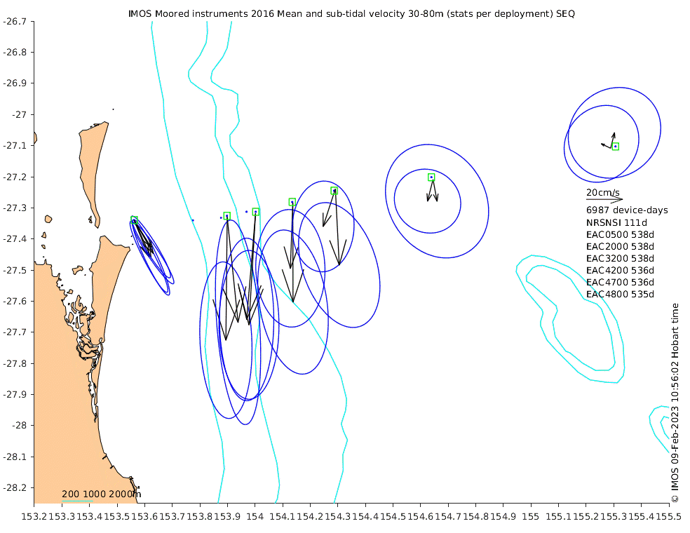 These maps show some basic analyses of the velocity data: mean and sub-tidal variance for several layers and time-windows, and tidal harmonics for the depth-average velocity using the whole record. Click through to see more detailed plots of the selected dataset or to download those data from the AODN thredds server.