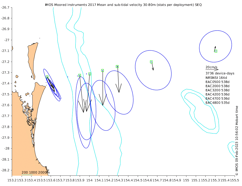 These maps show some basic analyses of the velocity data: mean and sub-tidal variance for several layers and time-windows, and tidal harmonics for the depth-average velocity using the whole record. Click through to see more detailed plots of the selected dataset or to download those data from the AODN thredds server.