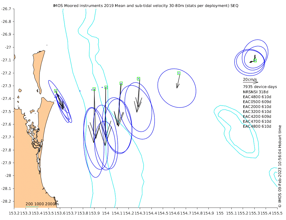 These maps show some basic analyses of the velocity data: mean and sub-tidal variance for several layers and time-windows, and tidal harmonics for the depth-average velocity using the whole record. Click through to see more detailed plots of the selected dataset or to download those data from the AODN thredds server.