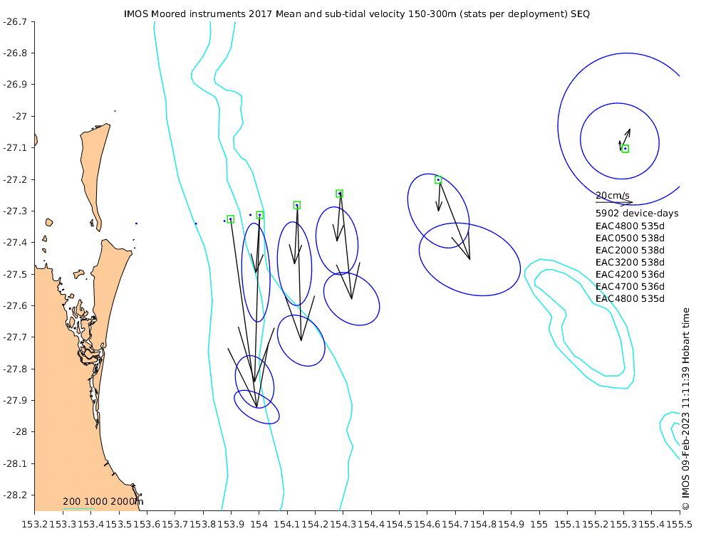 These maps show some basic analyses of the velocity data: mean and sub-tidal variance for several layers and time-windows, and tidal harmonics for the depth-average velocity using the whole record. Click through to see more detailed plots of the selected dataset or to download those data from the AODN thredds server.