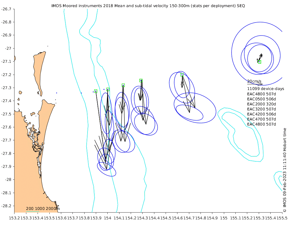These maps show some basic analyses of the velocity data: mean and sub-tidal variance for several layers and time-windows, and tidal harmonics for the depth-average velocity using the whole record. Click through to see more detailed plots of the selected dataset or to download those data from the AODN thredds server.