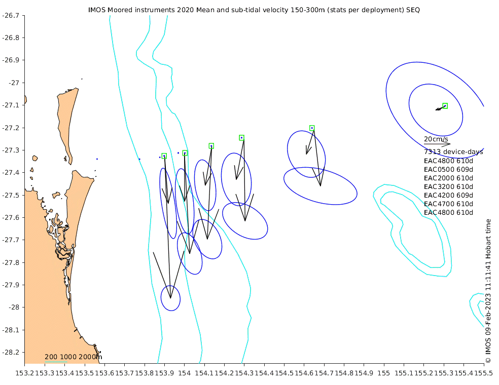 These maps show some basic analyses of the velocity data: mean and sub-tidal variance for several layers and time-windows, and tidal harmonics for the depth-average velocity using the whole record. Click through to see more detailed plots of the selected dataset or to download those data from the AODN thredds server.